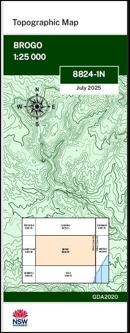 Brogo 1-25,000 NSW Topographic Map 8824-1-N Print on Demand is used for Walking, 4WD, Fishing, Camping, Motorcycle, both On and Off Road, Gold Prospecting and for those simply going for a family weekend drive.