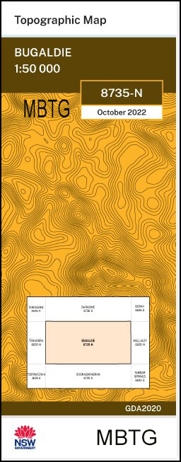 Bugaldie 1-50,000 scale NSW Topographical map is used for Walking, 4WD, Fishing, Camping, Motorcycle, both On and Off Road, Gold Prospecting and for those simply going for a family weekend drive.