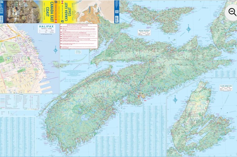 The second side of the map focusses on Nova Scotia/Cape Breton and parts of Prince Edward Island and New Brunswick, with a detailed inset of central Halifax. The former French fortress of Louisbourg is a must-see for anyone visiting Cape Breton, as are the many Loyalist towns created along the coast of Nova Scotia to house refugees fleeing turmoil in the American colonies during the Revolutionary War. A separate map concentrating on the Atlantic coastline of the USA is being prepared.