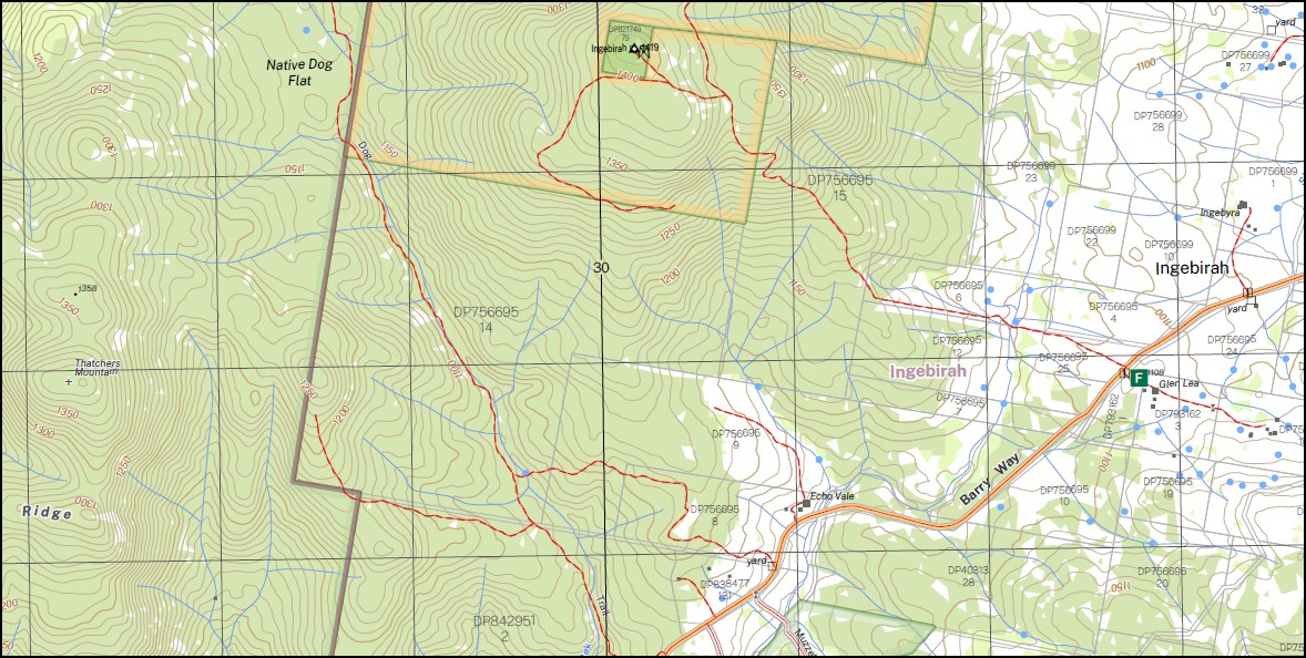 This map includes the following localities: AAWT Bark Camp Creek Beurina Bills Garden Creek Blackfellow Mountain Charcoal Gap Charcoal Gap Creek Charcoal Range Clapton Connors Camp Creek Connors Gap Feltons Creek Grose Halfpenny Hill Ingebirah Ingebirah Creek Ingebirah Gap Ingeegoodbee River Jacobs Jacobs Ladder Jacobs River Jimmys Stairs East Point Half Penny Jack Wall Creek Jack Walls Creek Jack Walls Range Jimmies Stairs Little Tin Mine Creek Lookout Lookout Creek Moyangul Moyangul or Pinch River Musslewood Flat Muzzlewood Flat Native Dog Flat North Blackfellow Penny Penny Hill mbtg Peters Creek Pigeon Springs Pigeon Springs Gap Pinch River Russian Gap Short Ridge Somen Mountain Somerset Hill Stockwhip Hill Suggan Buggan Range Swamp or Tingebirah Creek Thatchers Flat Creek Thatchers Hole Creek Thatchers Mountain Thatchers Mountain Creek The Beehive The Big Rocks Tongaroo or Jacobs River Wales Creek Walls Creek Wild Bull Creek Witts Camp Dray Bridge Creek Dray Ridge Creek Wallace Craigie Lookout The Brindle Bull Brindle Bull Ridge