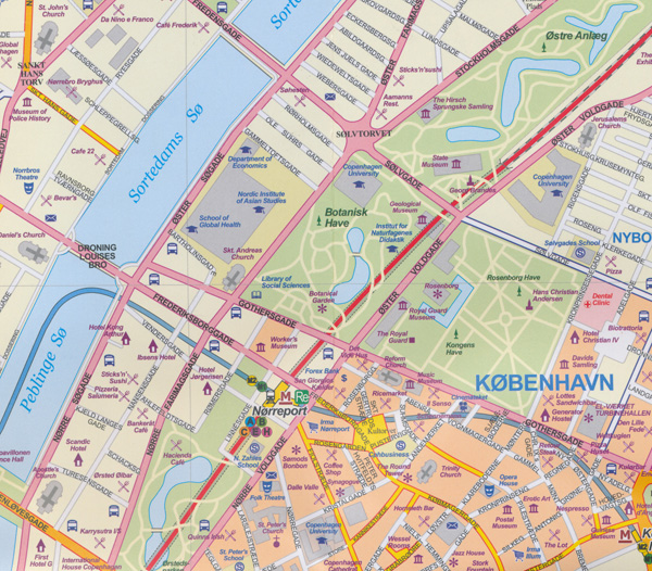 This map consists of a brand new country map in the ITMB style, using our own artwork, and an updated version of Copenhagen filling the reverse side. The city side covers most of the urban area, Copenhagen not being a huge metropolis to begin with, with a good coverage for hotels, restaurants, even bus stops, pedestrian shopping streets in the city centre, important buildings and museums, parks, rail stations and lines, and touristic attractions.