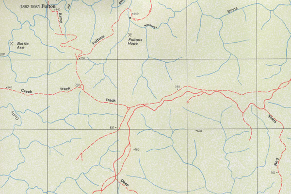 - Creeks- The majority of creeks shown are simply run-offs where water channels down the slope of the mountain. These help drivers estimate the condition of a track and the shape of the terrain. They also provide a navigational tool for mine enthusiasts walking off the beaten track.