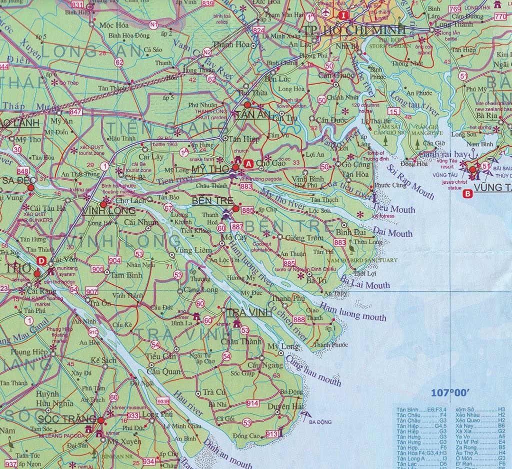 The ‘Nine Mouths of the Dragon’ southernmost portion of VN, of which HCM City is a part, is a fascinating part of Asian life, where fervent religious temples originating with the Cham culture of Cambodia co-exist with the Cao Dai amalgam religious movement. ITMB’s Mekong Delta map will continue to be marketed separately.