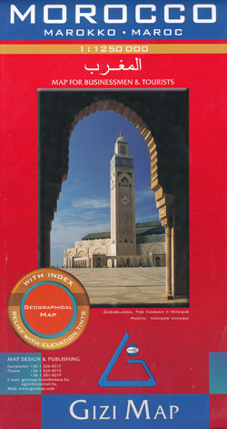 This folded tourist and road map of Morocco features shaded-relief and elevation tinting. Major and minor roads are depicted along with railways, distance in kilo meters, administrative boundaries, airports, historical sites, points of interest, tourist sites, and natural features. Includes index of placenames.