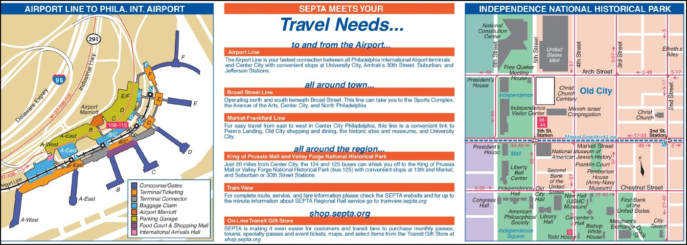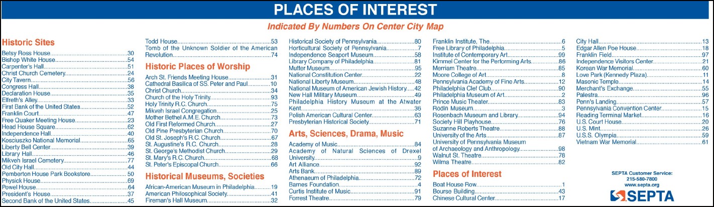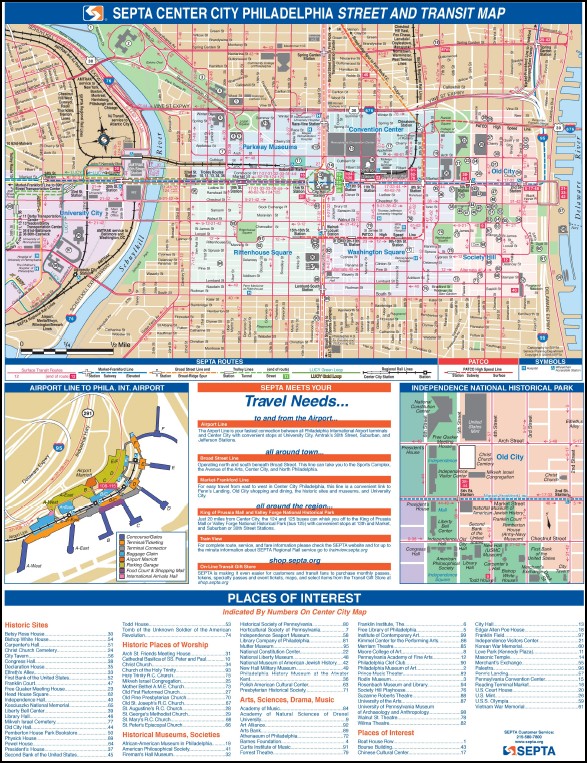 Show the Philadelphia City Centre with Streets, major points of interest, Surface and Subway Routes, Trolley Lines, an inset map of the Philadelphia International Airport and a List of major sights to see.