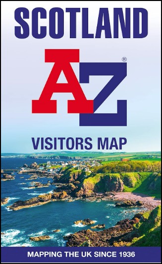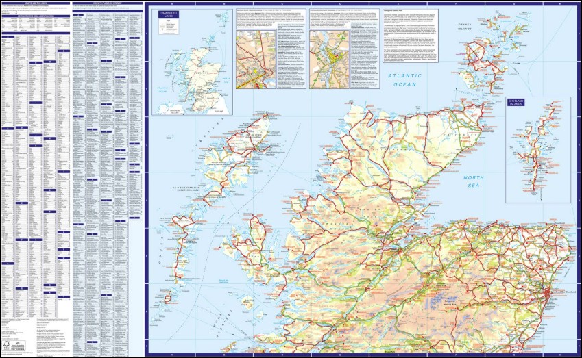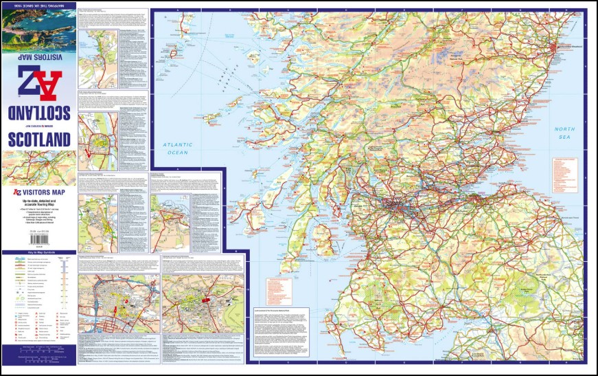 - 8 inset street maps to major cities and popular destinations, including: Edinburgh, Glasgow, Stirling, and Cairngorms National Park, with detailed descriptions and places of interest