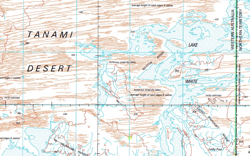 Bibarrd Aboriginal Outstation Brookman Waters Carnegie Bluff Erica Ranges Hidden Basin Kalpungku Soak Kuna Yuna Creek Laka Claypan Lake Hazlett Lake White Lake Wills Lamanbandah Aboriginal Outstation Lucky Pool Mount Russell Murraba Ranges Nakar Creek Ngatitjiri Creek Nicker Creek Point Moody Redcliff Pound Sidney Margaret Range Stansmore Range Talapanta Claypan Tingaritjata Claypan Tirriparri Claypan Tjulyurulyuru Creek Walgali Aboriginal Outstation Wantitjarra Claypan Warri Creek Warri Peak Weston Basin White Hills Wilson Glen Wirril Rockhole Yapparu Claypan Erica Range